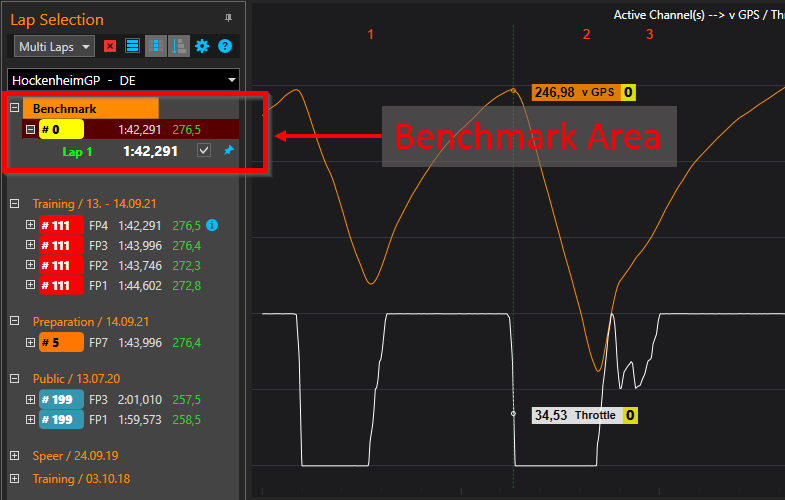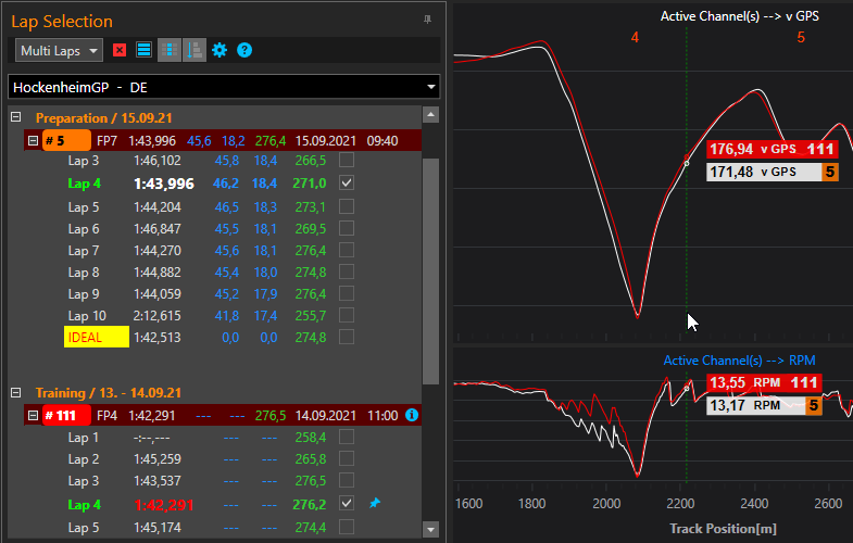 Der "Lap Selection" Bereich beinhaltet alle Datensätze, die für eine Strecke bereits importiert wurden. Zusammen fassende Events werden automatisch erzeugt. Über eine Checkbox legst Du fest, welche Runden für die Darstellung (und somit die Analyse) verwendet werden sollen.