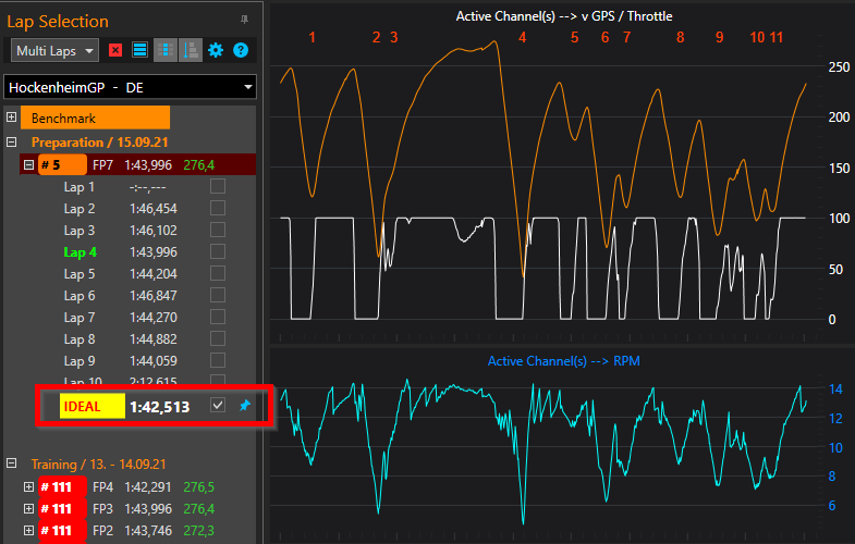 Aus den besten Abschnitten wird die Idealzeit des Datensatzes bestimmt und angezeigt. Wer kennt das nicht, auf einer schnellen Runde war ein langsamerer Fahrer im Weg! Mit der Idealzeit kann trotzdem die vermeintliche Rundenzeit abgelesen werden.